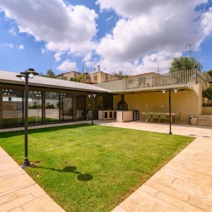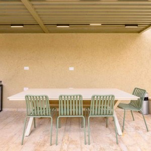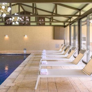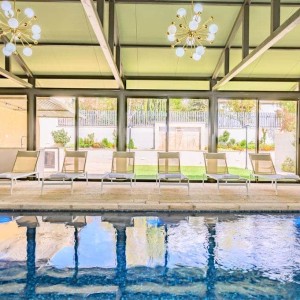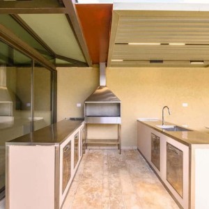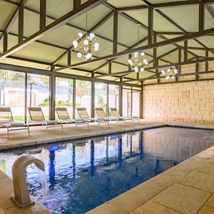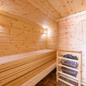 Each suite includes access to a communal area which features a heated, salt-sanitized swimming pool, a luxurious dry sauna, steam rooms, a well-equipped dining area, an outdoor kitchen with a grill and refrigerators stocked with complimentary beverages, lush landscaping, and atmospheric lighting.